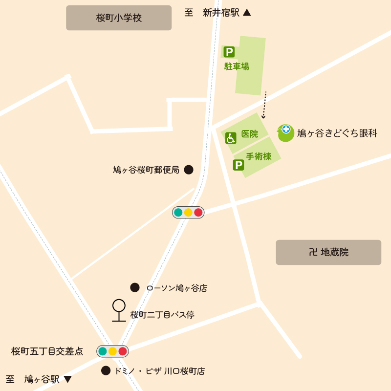 新井宿駅前の県道南側に当院の看板が設置されております。看板を右手に見ながら、次の信号(新井宿駅東交差点)まで進んでください。