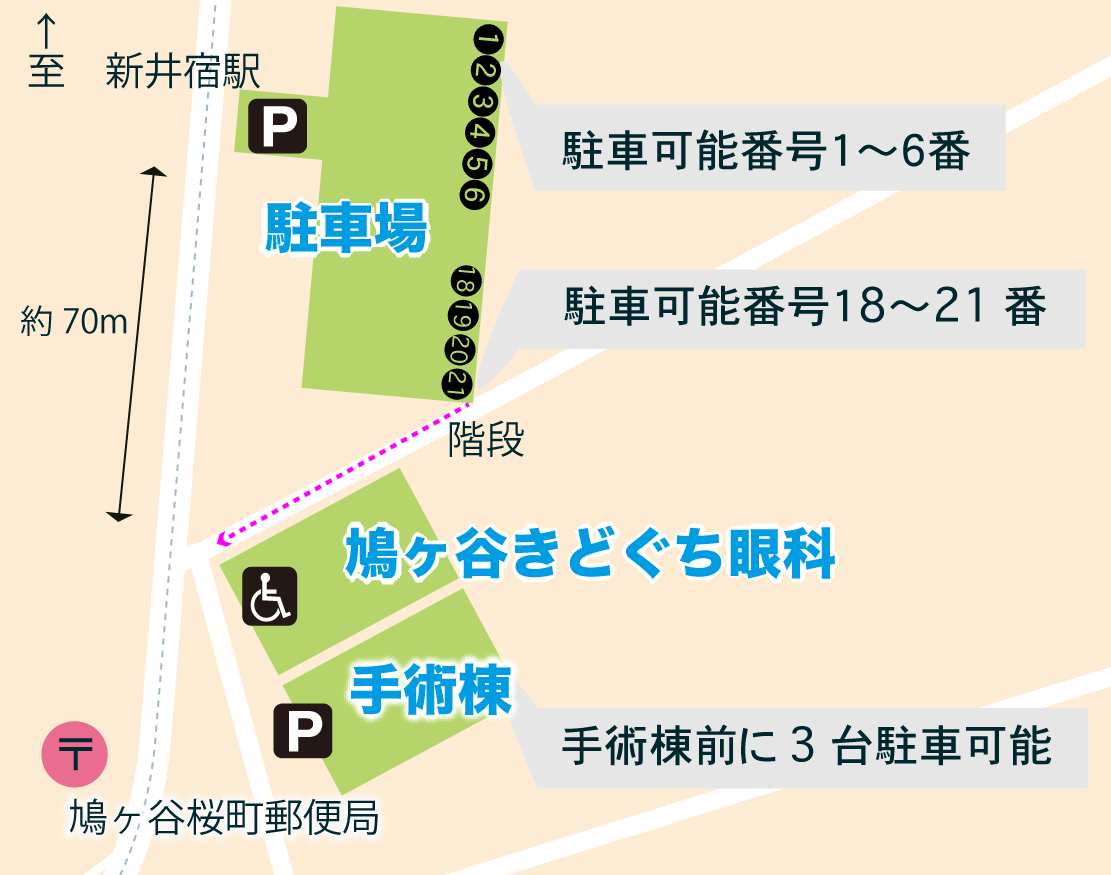 ● 当院から70mほど離れた桜町駐車場の中に10台(桜町駐車場は必ず1,2,3,4,5,6番もしくは18,19,20,21番のご利用をお願いします)
