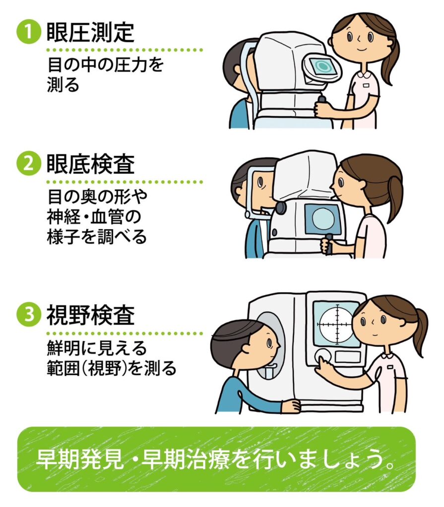 40歳以上では20人に1人が緑内障であるといわれています。ぜひ眼科での診察(眼圧や視神経乳頭の評価)をおすすめします。