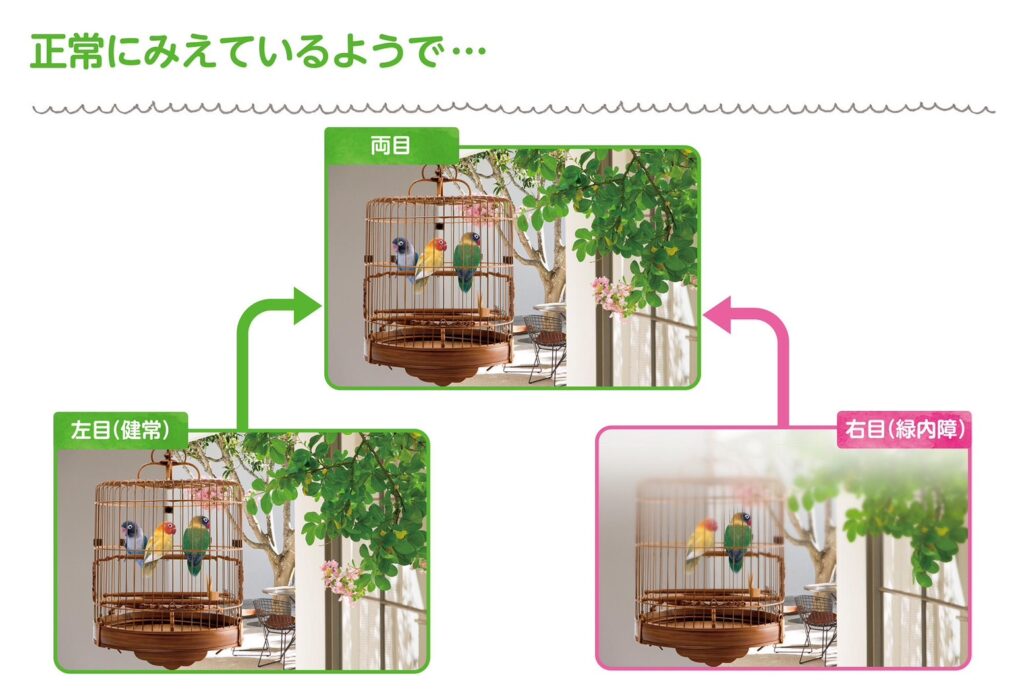 - 視野の影に自身で気がつくことが難しい(かなり進行した緑内障でない限り、ご自覚症状がでない)